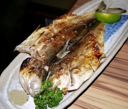 自製一夜干(320),魚肉口感細緻,不過這比較像一般烤魚哩...特別的是,這兒用日式居酒屋獨特的抹茶鹽,帶著淡淡清香唷。