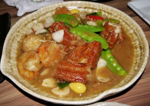 XO醬爆蝦球(280),這道菜就比較中式,蝦肉份量夠大,味道上也還算夠。只是上頭也有油條耶,好妙。